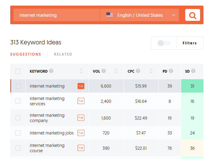 You can look for as many keywords as you wish without any limitations, you can also see other metrics as a: search volume, CPC, PD, and SD. (I know those terms looks kind of scary, will explain below)